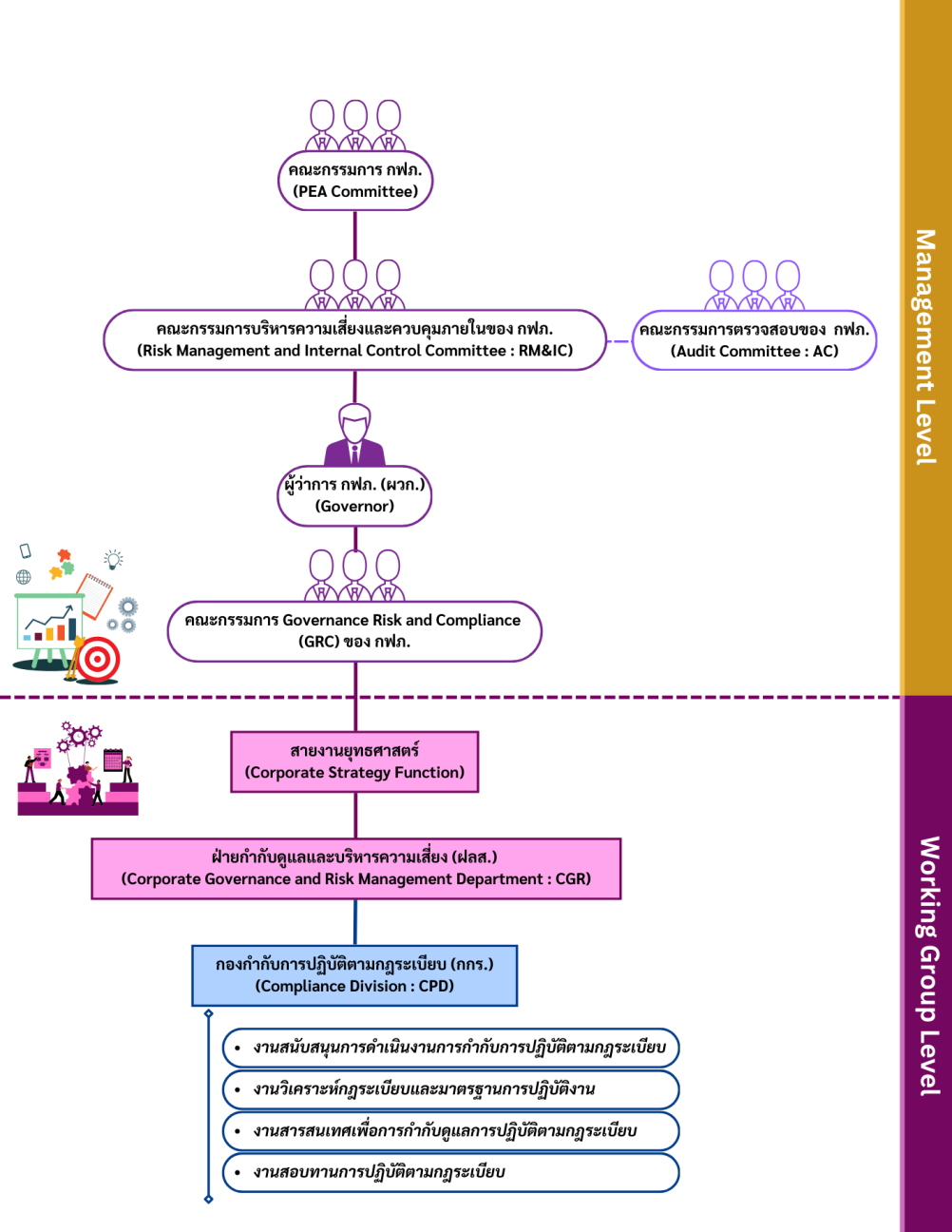 กองกำกับการปฏิบัติตามกฎระเบียบ ฝ่ายกำกับดูแลและบริหารความเสี่ยง ทำหน้าที่เป็นหน่วยงานกำกับดูแลการปฏิบัติตามกฎระเบียบ (Compliance Unit) ของการไฟฟ้าส่วนภูมิภาค มีบทบาทสำคัญในการสร้างและรักษาธรรมาภิบาลที่ดีขององค์กร โดยกำหนดกรอบการกำกับดูแลการปฏิบัติตามกฎระเบียบ (Compliance Framework) ส่งเสริมวัฒนธรรมการปฏิบัติตามกฎระเบียบ (Compliance Culture) ผ่านการประชาสัมพันธ์ และกิจกรรมเสริมสร้างความรู้และจิตสำนึกอย่างต่อเนื่อง และบริหารจัดการ กำกับดูแลการปฏิบัติตามกฎระเบียบ (Compliance) ในภาพรวมขององค์กรให้สอดคล้องกับกฎหมายและข้อกำหนด รวมถึงการสนับสนุน ส่งเสริมการดำเนินธุรกิจให้เกิดความคล่องตัว ลดความผิดพลาด บรรลุผลสำเร็จตามวัตถุประสงค์และเป้าหมายที่การไฟฟ้าส่วนภูมิภาคกำหนด