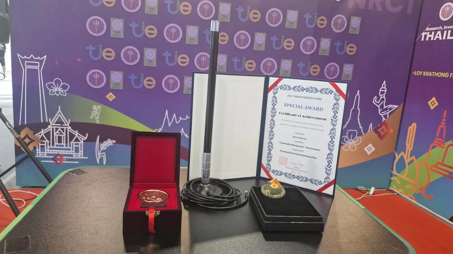 4.รางวัลระดับเหรียญทองแดง (BRONZE MEDAL AWARD) และรางวัลพิเศษ (SPECIAL AWARD) จาก Taiwan Invention Association จากผลงาน สายอากาศไปทั่วทิศ (Omni Antenna) เป็นสายอากาศรูปแบบใหม่ โดยใช้หลักการ Collinear 1/4 Wave สำหรับความถี่ 440–450 MHz ซ้อน 2 ชั้น พร้อม Phase Delay/Coil Choke เพื่อเพิ่ม Gain 3–5 dBi ควบคุมทิศทางแนวราบและได้ค่า VSWR ≤ 1:1.5 ผลการทดสอบพบว่าสามารถใช้งานร่วมกับ DAU(WRL) ได้ใกล้เคียงกับ YAGI เดิม ลดปัญหาสายอากาศชำรุด ประหยัดเวลา และลดค่าใช้จ่าย