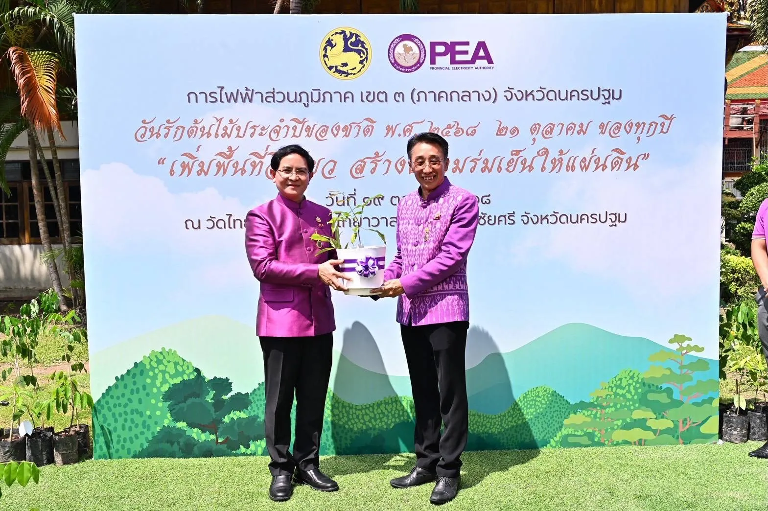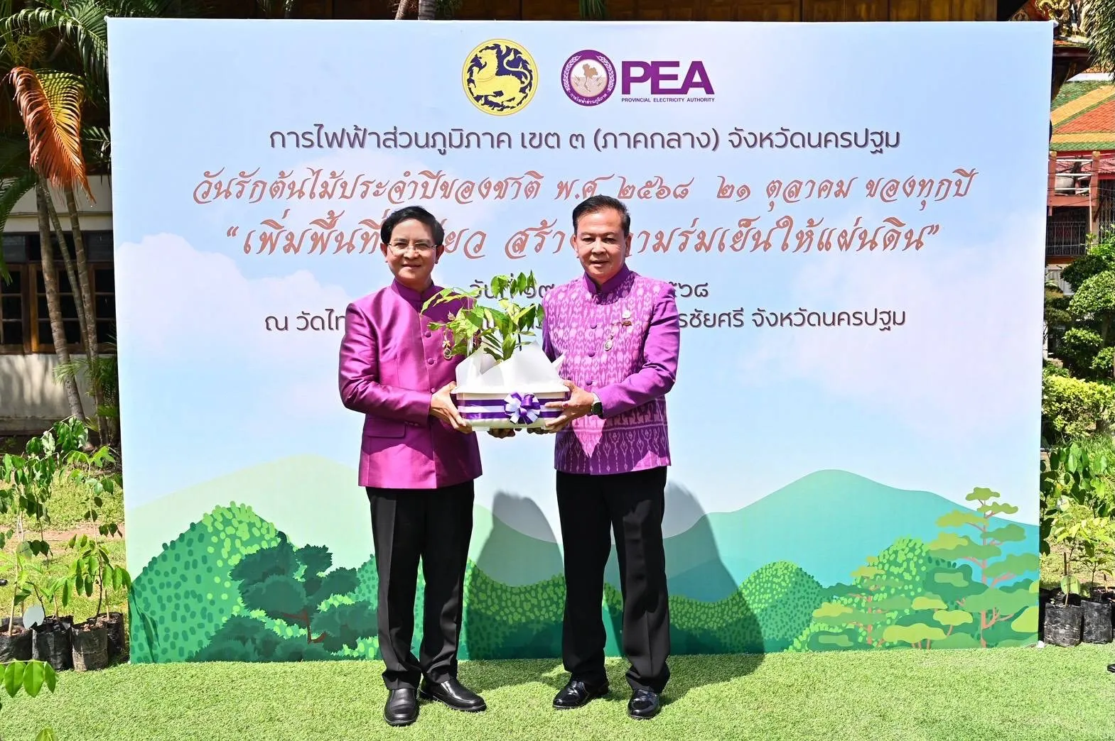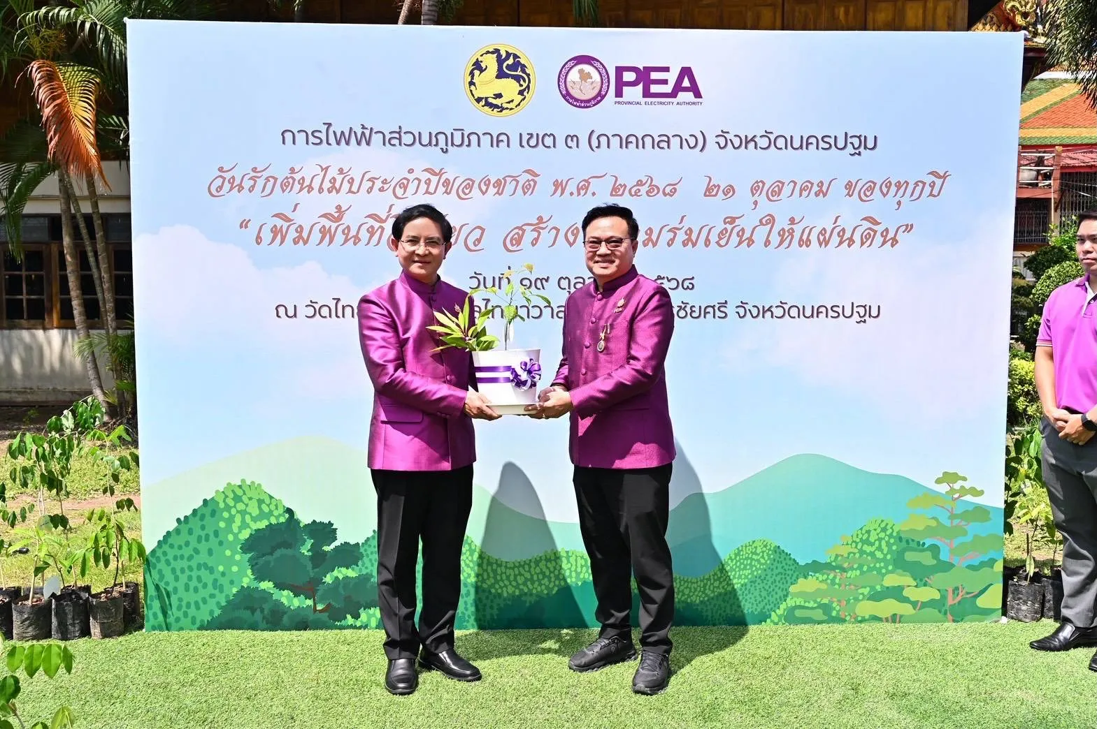 นายมงคล ตรีกิจจานนท์ ผู้ว่าการการไฟฟ้าส่วนภูมิภาค ให้เกียรติเป็นประธานในกิจกรรม วันรักต้นไม้ประจำปีของชาติ พ.ศ. 2568 เนื่องในโอกาสวันคล้ายวันพระราชสมภพของสมเด็จพระศรีนครินทราบรมราชชนนี ในวันที่ 21 ตุลาคมของทุกปี เพื่อน้อมรำลึกถึงพระมหากรุณาธิคุณของสมเด็จพระศรีนครินทราบรมราชชนนี สร้างการปลูกจิตสำนึกรักและหวงแหนทรัพยากรป่าไม้ของชาติ โดยส่งมอบต้นกล้าให้กับ ผู้บริหาร และ ผู้จัดการการไฟฟ้าส่วนภูมิภาค ในสังกัด เพื่อนำไปปลูกในพื้นที่รับผิดชอบ พร้อมปลูกต้นรวงผึ้ง เพื่อส่งเสริมการมีส่วนร่วมในการเพิ่มพื้นที่สีเขียว ลดปัญหาภาวะโลกร้อน และรักษาสมดุลของระบบนิเวศ โดยมี นายพีระพล ปูรณะโชติ รองผู้ว่าการการไฟฟ้าส่วนภูมิภาค นายธนะ โชคพระสมบัติ ผู้ช่วยผู้ว่าการการไฟฟ้าส่วนภูมิภาค เขต 3 (ภาคกลาง) จังหวัดนครปฐม ให้การต้อนรับ ณ วัดไทยาวาส ตำบลไทยาวาส อำเภอนครชัยศรี จังหวัดนครปฐม