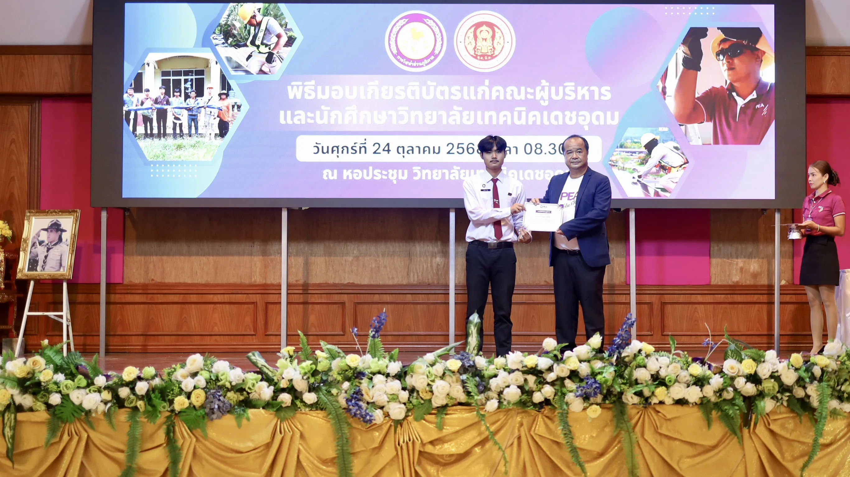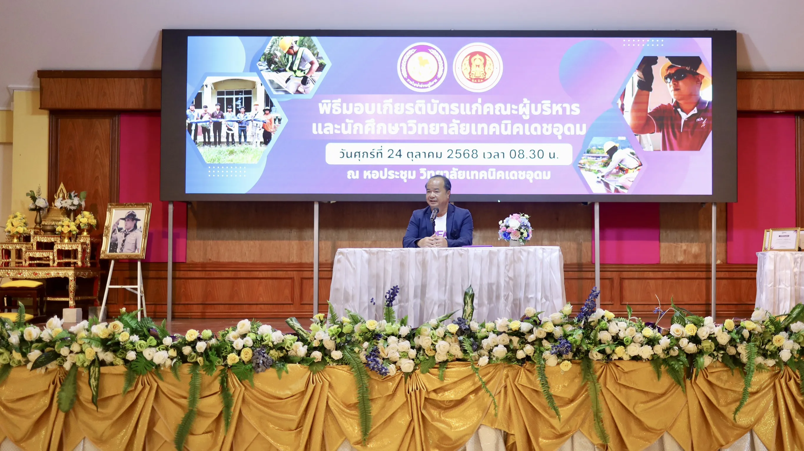 วันที่ 24 ตุลาคม 2568 เวลา 09.00 น. นายทรงศักดิ์ พิกุลทอง ผู้ช่วยผู้ว่าการการไฟฟ้าส่วนภูมิภาค เขต 2 (ภาคตะวันออกเฉียงเหนือ) จังหวัดอุบลราชธานี เป็นประธานในพิธีมอบประกาศเกียรติบัตรแก่คณะผู้บริหาร และนักศึกษาวิทยาลัยเทคนิคเดชอุดม จำนวน 52 คน ผู้ร่วมเป็นอาสาสมัครลงพื้นที่ซ่อมแซมระบบไฟฟ้าภายในครัวเรือนช่วยเหลือประชาชนที่ได้รับผลกระทบจากเหตุการณ์ชายแดนไทย–กัมพูชา จำนวน 146 ครัวเรือนในพื้นที่อำเภอน้ำยืน อำเภอน้ำขุ่น อำเภอนาจะหลวย จังหวัดอุบลราชธานี เมื่อวันที่ 23 สิงหาคม 2568 ที่ผ่านมา ณ ห้องประชุมวิทยาลัยเทคนิคเดชอุดม อำเภอเดชอุดม จังหวัดอุบลราชธานี