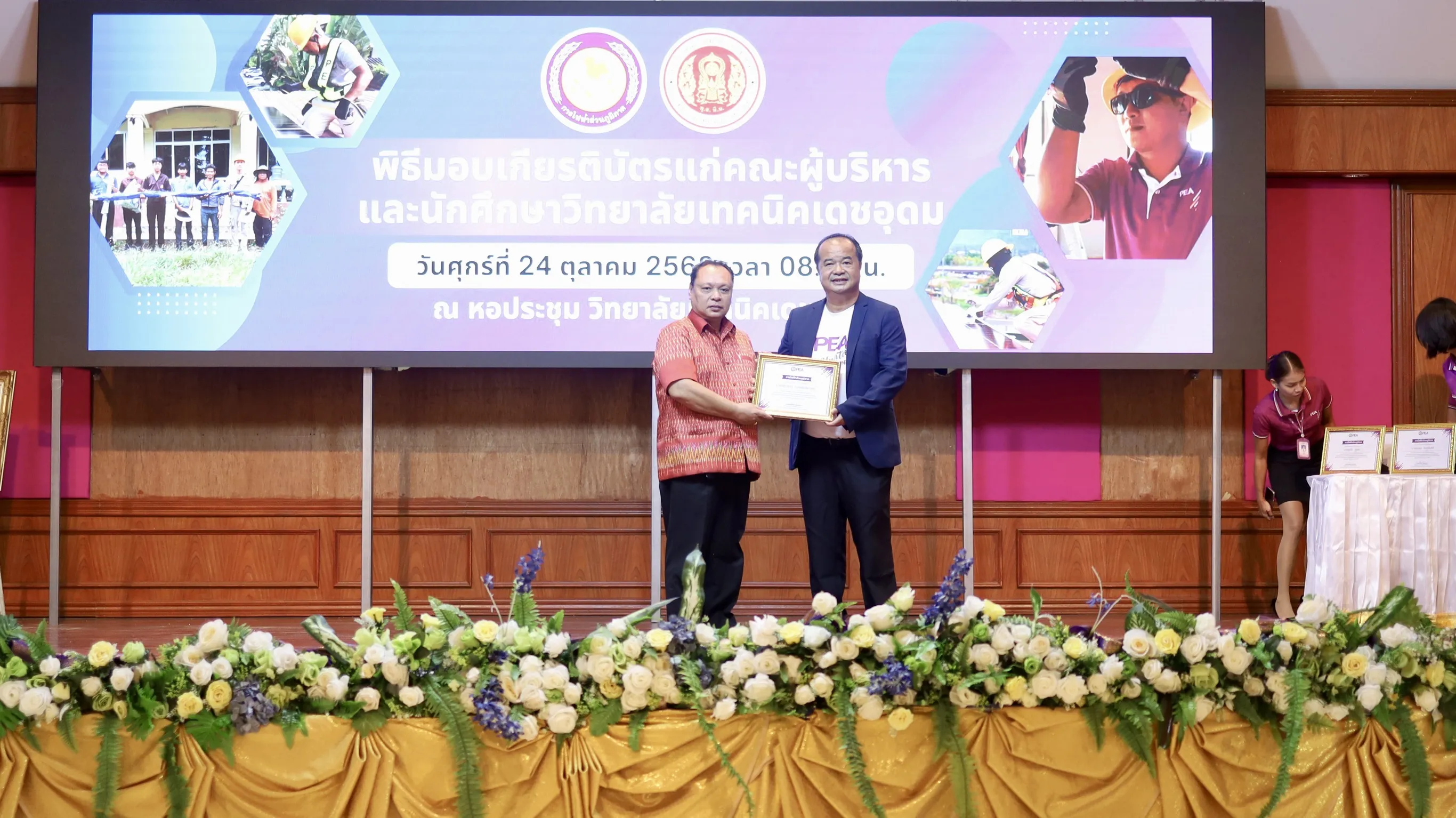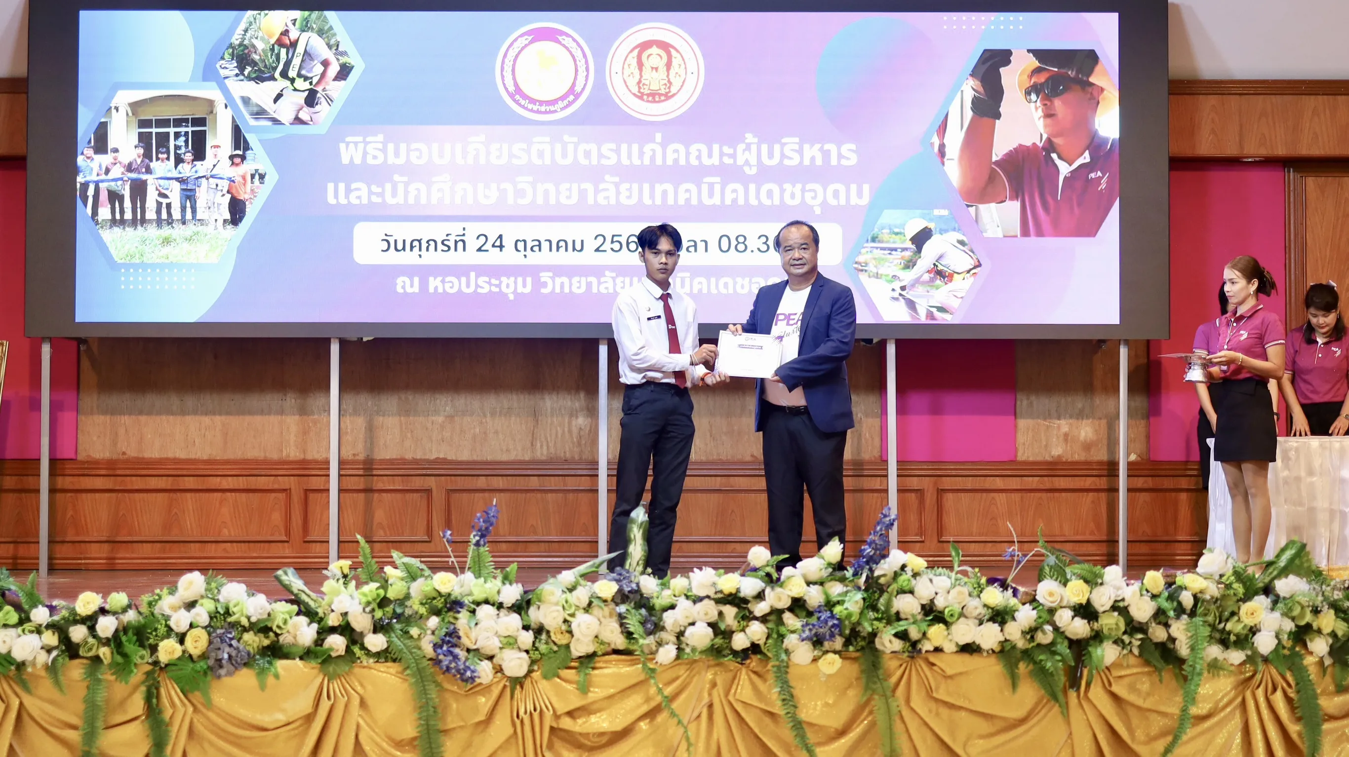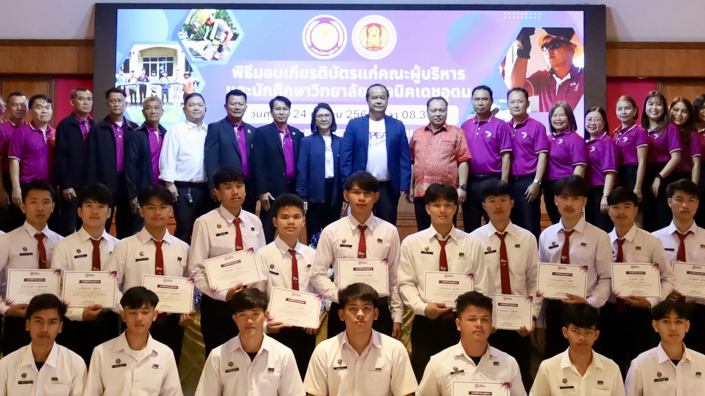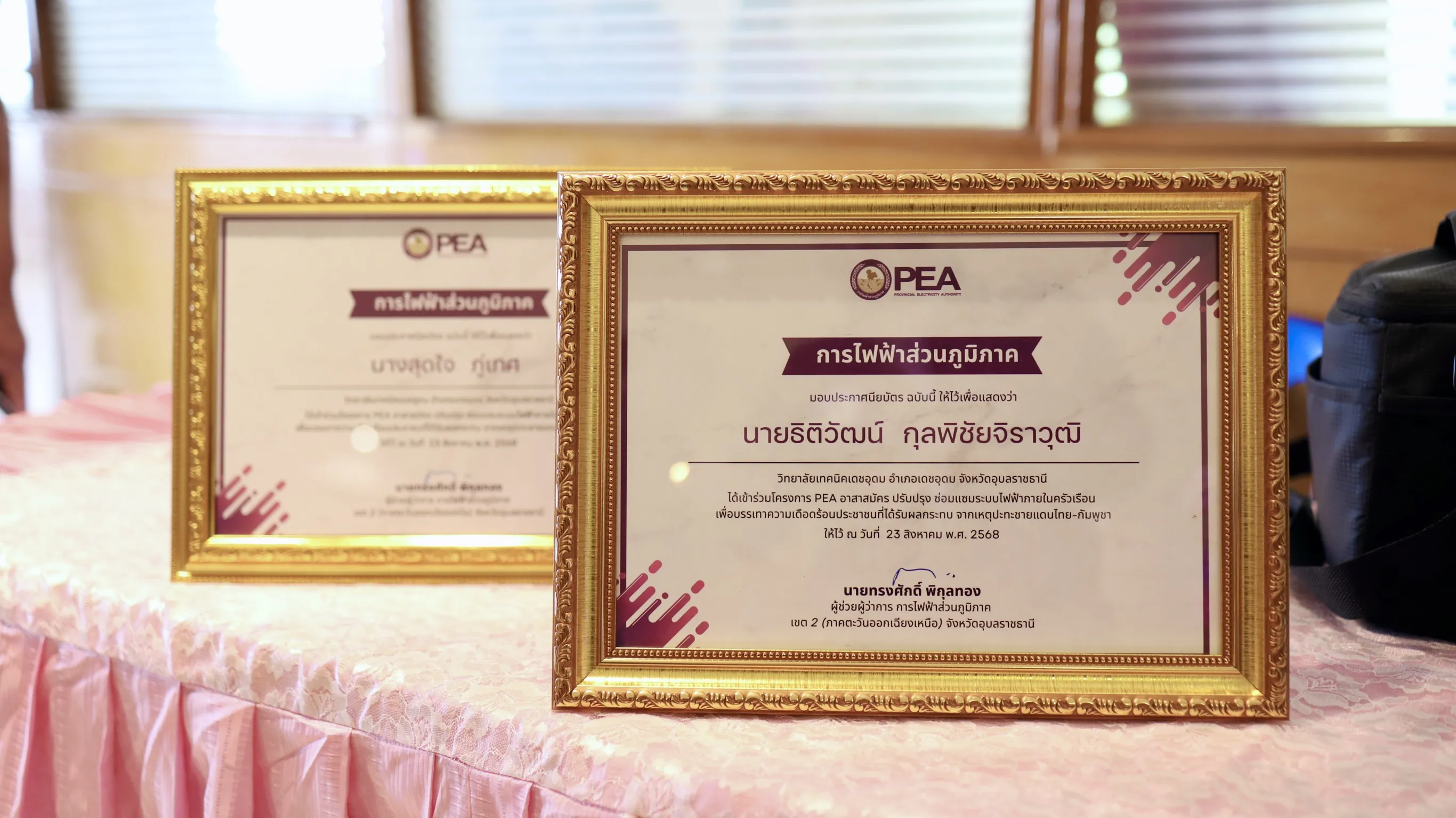 PEA มอบเกียรติบัตรให้กับช่างไฟฟ้าจิตอาสาวิทยาลัยเทคนิคเดชอุดม ผู้ร่วมสนับสนุนโครงการ PEA อาสาสมัครปรับปรุงซ่อมแซมระบบไฟฟ้าภายในครัวเรือนช่วยเหลือประชาชนผู้ได้รับผลกระทบจากเหตุปะทะชายแดนไทย-กัมพูชา