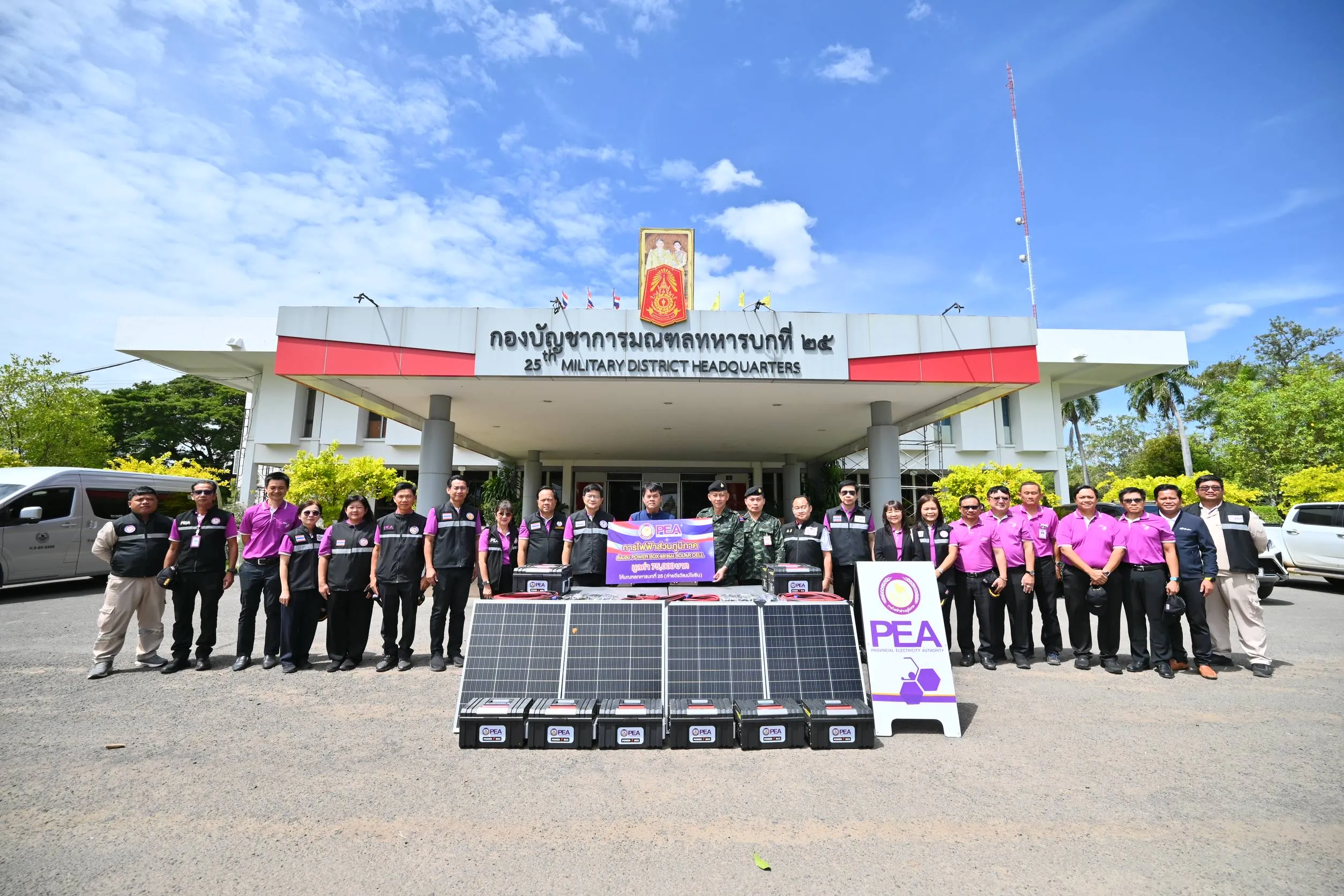 วันที่ 24 ตุลาคม 2568 นายขจร โปร่งฟ้า รองผู้ว่าการการไฟฟ้าส่วนภูมิภาค เป็นประธานในพิธีมอบชุด PEA Power Box และ Solar Cell จำนวน 10 ชุด โดยมี พลตรี ไชยนคร กิจคณะ ผู้บัญชาการมณฑลทหารบกที่ 25 เป็นผู้รับมอบ ณ มณฑลทหารบกที่ 25 (ค่ายวีรวัฒน์โยธิน) จังหวัดสุรินทร์
