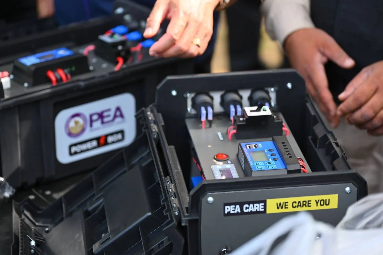 ชุด PEA Power Box มีขนาดพิกัด Inverter 1,000 วัตต์ แบตเตอรี่ 12 VDC 30 Ah เป็นการออกแบบและพัฒนาขึ้นจากฝีมือพนักงานการไฟฟ้าส่วนภูมิภาค มีความแข็งแรง ทนทาน ใช้งานง่าย กันน้ำได้ และสามารถชาร์จพลังงานจากระบบไฟฟ้าในบ้าน หรือจากแผง Solar Cell เหมาะกับการใช้งานภาคสนามที่อยู่ในป่าและพื้นที่ห่างไกลจากระบบไฟฟ้า