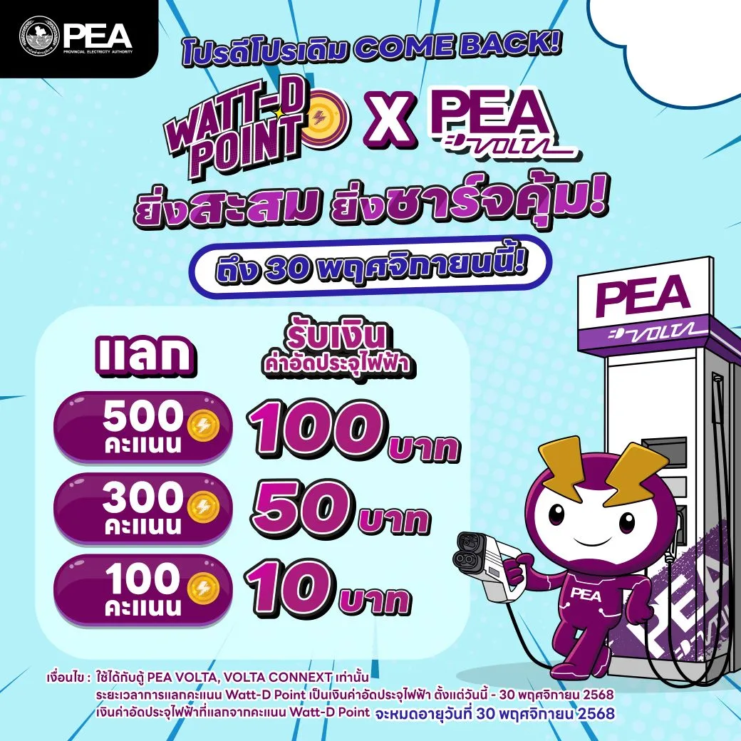 โปรดีโปรเดิมของชาว EV COME BACK! 🚙🎉 Watt-D Point X PEA VOLTA 💜🔌ยิ่งสะสม ยิ่งชาร์จคุ้ม!