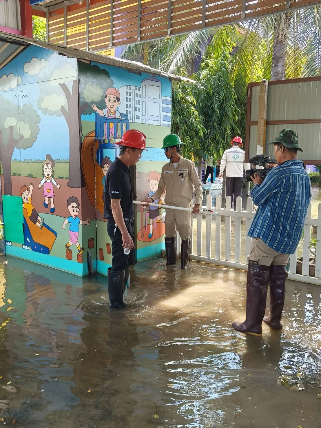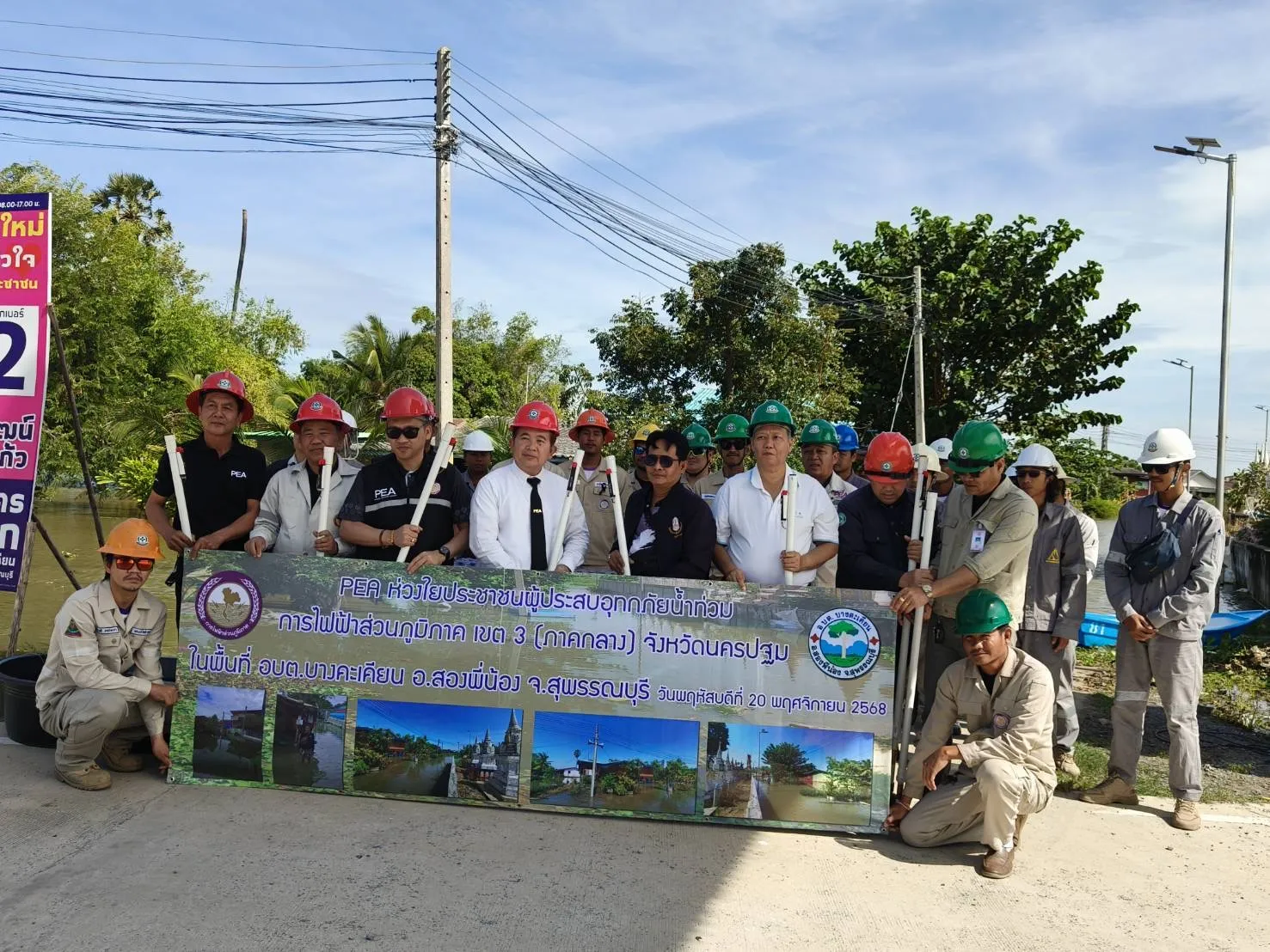 วันที่ 20 พฤศจิกายน 2568 การไฟฟ้าส่วนภูมิภาค (PEA) ระดมเจ้าหน้าที่ ลงพื้นที่ตรวจสอบจุดเสี่ยงที่อาจจะเกิดอันตรายจากกระแสไฟฟ้ารั่ว เพื่อความปลอดภัยของประชาชนในพื้นที่อำเภอสองพี่น้อง ที่ได้รับผลกระทบจากสถานการณ์น้ำท่วมขังเป็นระยะเวลานาน พร้อมทั้งมอบน้ำดื่ม PEA จำนวน 150 โหล และแนะนำการใช้ไฟฟ้าในกรณีที่น้ำท่วมหรือน้ำท่วมขังให้กับประชาชนที่ประสบอุทกภัย บริเวณวัดบางซอ ตำบลบางตะเคียน อำเภอสองพี่น้อง จังหวัดสุพรรณบุรี