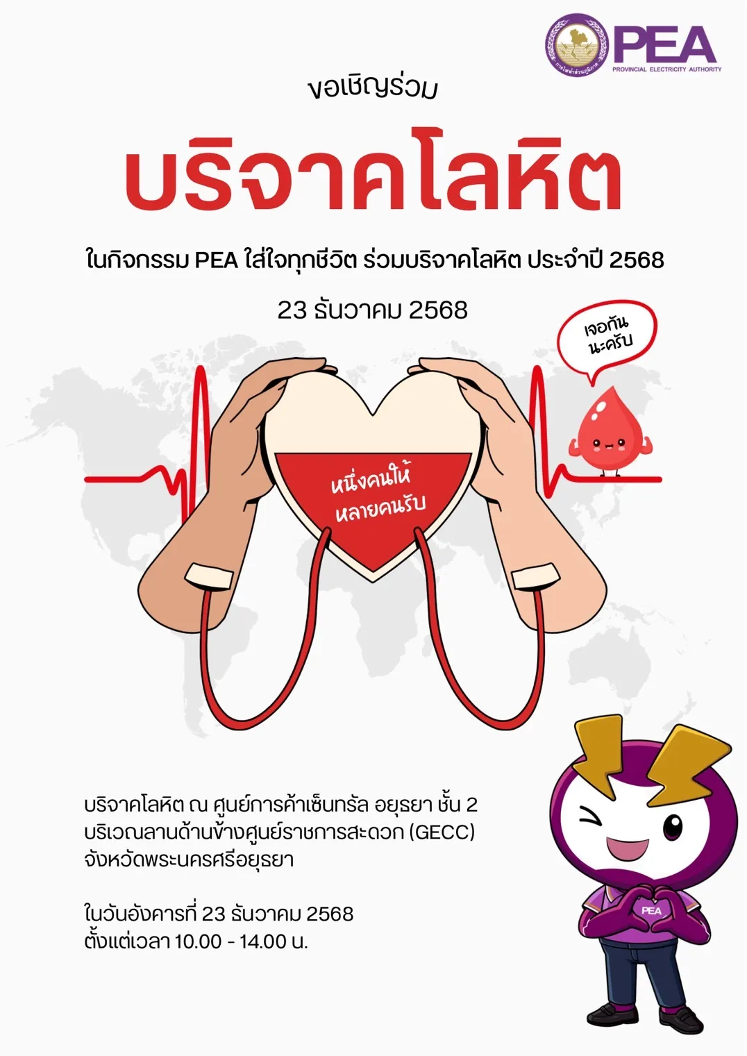 17 ธันวาคม 2568❤️🩸PEA ขอเชิญร่วมบริจาคโลหิต วันที่ 23 ธันวาคม 2568 เวลา 10.00 น. -14.00 น. บริเวณลานด้านข้างศูนย์ราชการสะดวก (GECC) ชั้น2 ศูนย์การค้าเซ็นทรัล อยุธยา 💉🩸แชร์โพสต์นี้FacebookTwitterLineข่าวที่คุณอาจสนใจPEA รับมอบโล่เกียรติคุณในฐานะหน่วยงานสนับสนุนทัพนักกีฬาไทย ในงาน “คืนที่ดาว...23 มกราคม 2569PEA ร่วมพิธีมอบอุปกรณ์ไฟฟ้ามาตรฐาน มอก. ช่วยเหลือผู้ประสบอุทกภัยภาคใต้23 มกราคม 2569PEA ให้การต้อนรับผู้อำนวยการการท่าเรือแห่งประเทศไทย และ คณะผู้บริหาร21 มกราคม 2569PEA ต้อนรับ คณะนักบริหารระดับสูง สถาบันพระปกเกล้า ศึกษาดูงาน...19 มกราคม 2569