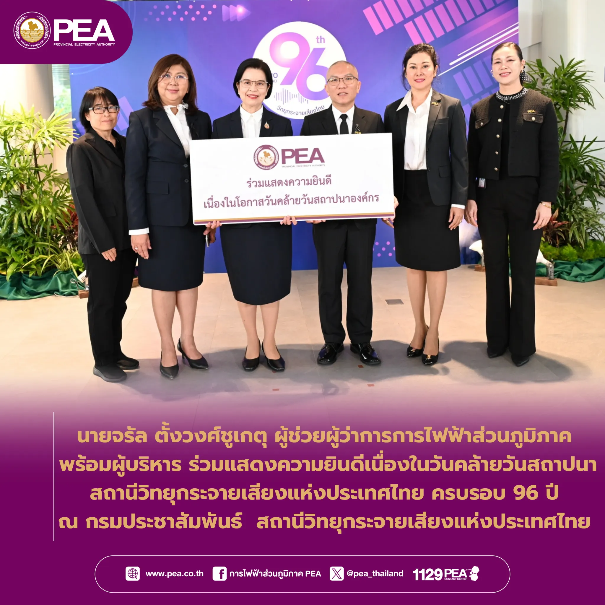 25 กุมภาพันธ์ 2569แชร์โพสต์นี้FacebookTwitterLineข่าวที่คุณอาจสนใจPEA ร่วมแสดงความยินดี สำนักงานนโยบายและแผนทรัพยากรธรรมชาติและสิ่งแวดล้อม ครบรอบ...19 กุมภาพันธ์ 2569PEA เปิดแคมเปญ “PEA Sabuy Service สบายทุกเรื่องไฟฟ้า“ ดึงโจอี้ ภูวศิษฐ์...18 กุมภาพันธ์ 2569PEA รับการตรวจการกำกับดูแลข้อมูลส่วนบุคคล และความมั่นคงปลอดภัยไซเบอร์ ประจำปี...17 กุมภาพันธ์ 2569PEA ร่วมแสดงความยินดีเนื่องในวันครบรอบ 32 ปี ...17 กุมภาพันธ์ 2569