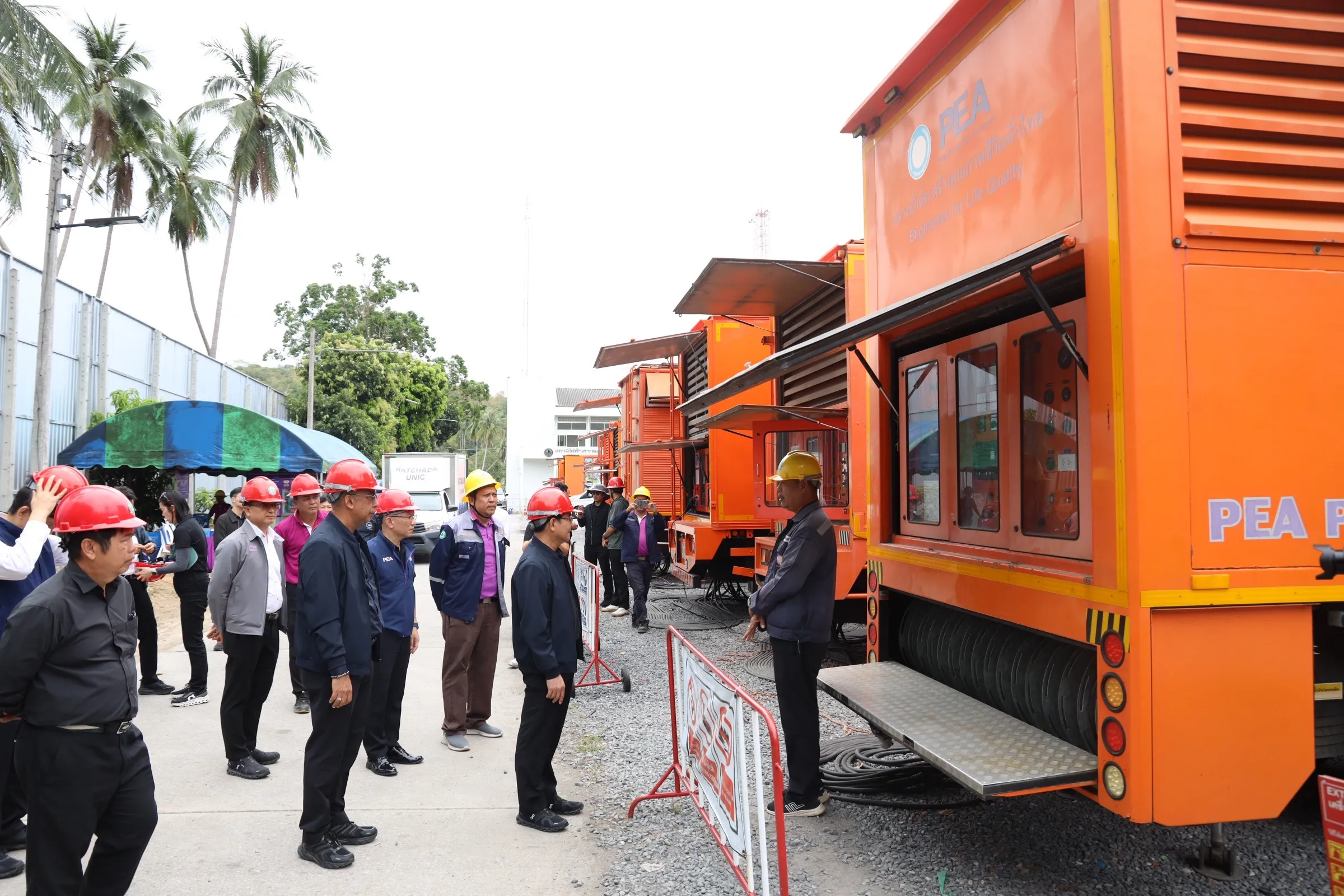 วันที่ 6 มีนาคม 2569 นายมงคล ตรีกิจจานนท์ ผู้ว่าการการไฟฟ้าส่วนภูมิภาค (PEA) พร้อมคณะผู้บริหาร ลงพื้นที่ติดตามการดำเนินงานตามแผนเสริมสร้างความมั่นคงของระบบไฟฟ้าในพื้นที่เกาะสมุย เกาะพะงัน และเกาะเต่า จังหวัดสุราษฎร์ธานี เพื่อเตรียมความพร้อมรองรับความต้องการใช้ไฟฟ้าที่เพิ่มขึ้นจากภาคการท่องเที่ยว โดยเดินทางไปยังจุดติดตั้งเครื่องกำเนิดไฟฟ้าสำรอง (Generator) ณ สถานีไฟฟ้าเกาะสมุย 1 และบริเวณซอยวิริยะ 1 ตำบลลิปะน้อย เพื่อตรวจสอบความพร้อมของพื้นที่ติดตั้งถังน้ำมันสำรอง รวมถึงความพร้อมของระบบไฟฟ้าหลักและระบบไฟฟ้าสำรอง เพื่อให้สามารถรองรับการจ่ายกระแสไฟฟ้าได้อย่างมีประสิทธิภาพ จากนั้น ผู้ว่าการฯ ประชุมหารือร่วมกับผู้บริหารและพนักงาน ณ สำนักงานการไฟฟ้าส่วนภูมิภาคสาขาเกาะสมุย เพื่อติดตามความคืบหน้าการดำเนินงานตามแผนเสริมสร้างความมั่นคงของระบบไฟฟ้า พร้อมมอบนโยบายให้พนักงานเตรียมความพร้อมของระบบไฟฟ้าทั้งระบบหลักและระบบสำรองให้มีประสิทธิภาพสูงสุด เพื่อรองรับความต้องการใช้ไฟฟ้าที่เพิ่มขึ้นในพื้นที่ท่องเที่ยวได้อย่างเพียงพอและต่อเนื่อง