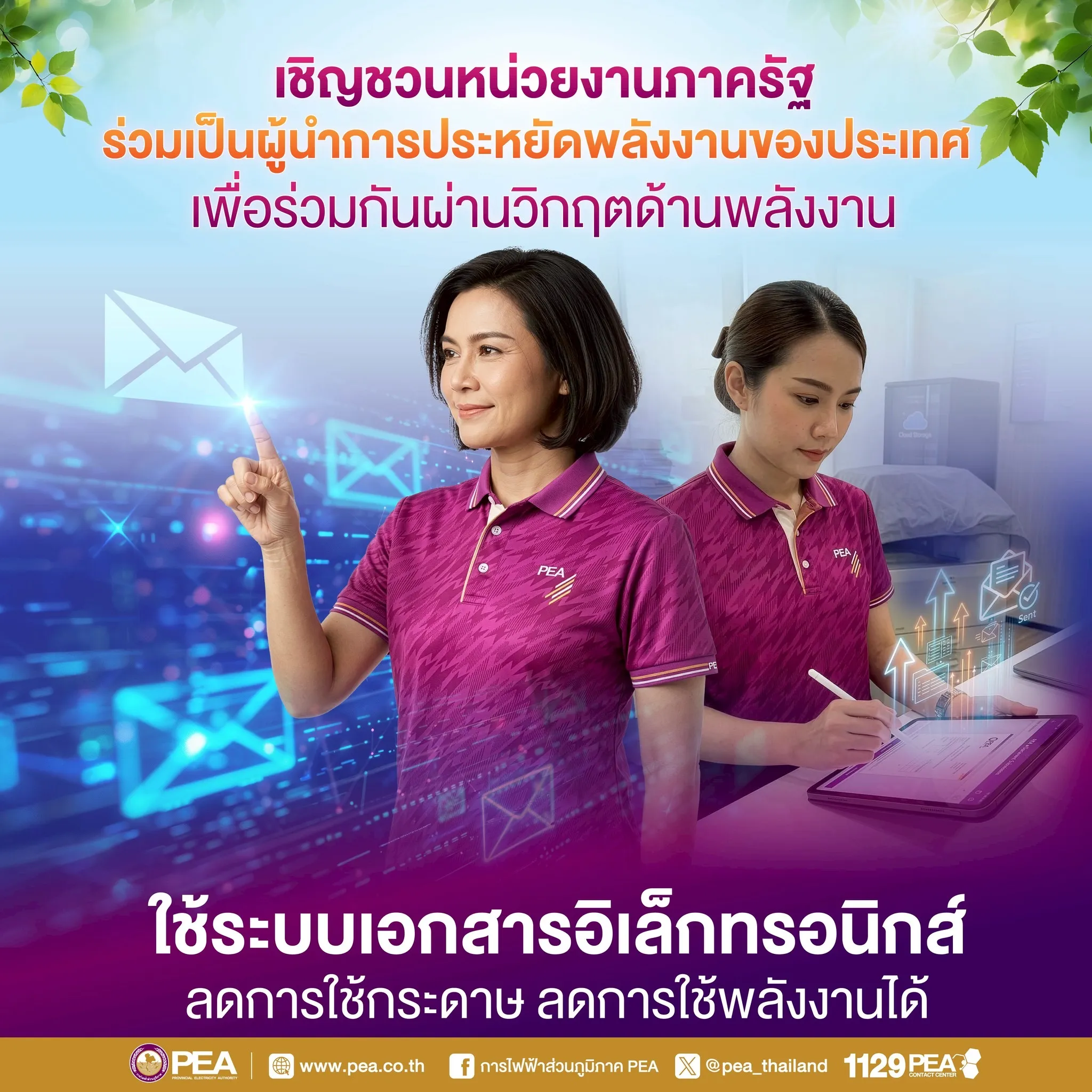 การไฟฟ้าส่วนภูมิภาค (PEA) ขอเชิญชวนหน่วยงานภาครัฐ ร่วมเป็นผู้นำการประหยัดพลังงานของประเทศ เพื่อช่วยลดภาระของระบบไฟฟ้า และสร้างความมั่นคงด้านพลังงานให้กับประเทศไทย