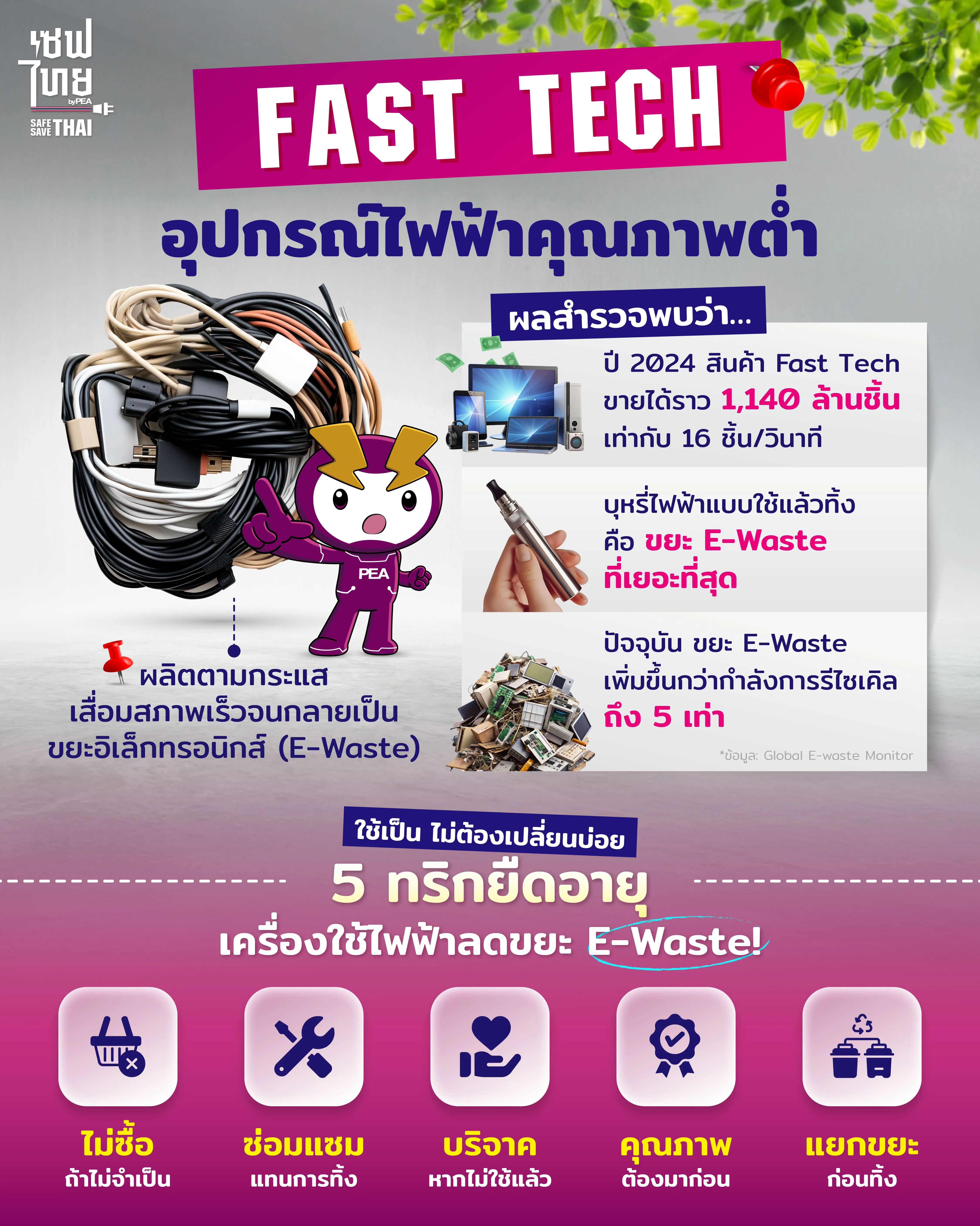 “Fast Tech” คือคำจำกัดความของอุปกรณ์ไฟฟ้าคุณภาพต่ำ ผลิตตามกระแส และเสื่อมสภาพเร็วจนกลายเป็น E-Waste หรือขยะอิเล็กทรอนิกส์ที่สร้างผลกระทบต่อสิ่งแวดล้อม 🌎
