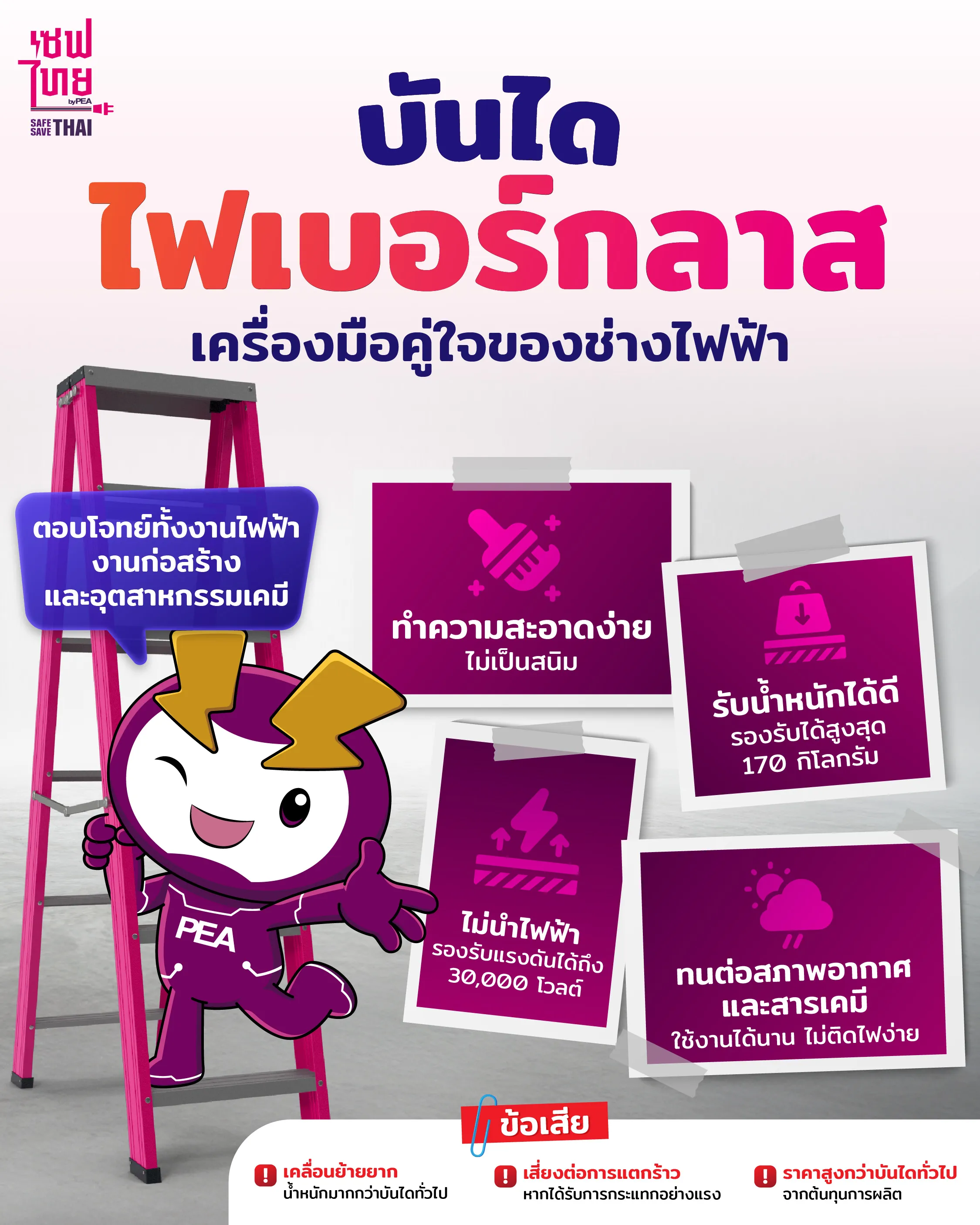 31 มกราคม 2569งานช่างไฟฟ้า ไม่ใช่จะใช้อุปกรณ์อะไรก็ได้ 💡เพราะอุปกรณ์จะต้องมีคุณสมบัติเป็นฉนวน ทนทาน และทนไฟ เหมาะกับการใช้งาน ซึ่ง “บันไดไฟเบอร์กลาส” 🪜 คือตัวเลือกคู่ใจที่ช่างไฟฟ้าต้องมี! ⚡️Tag:เซฟไทยsafesavethaiการไฟฟ้าส่วนภูมิภาคPEAอุปกรณ์บันไดไฟเบอร์กลาสแชร์โพสต์นี้FacebookTwitterLineข่าวที่คุณอาจสนใจเผาหญ้าใกล้เสาไฟฟ้า อันตรายที่ไม่จบแค่ไฟดับ20 กุมภาพันธ์ 2569คู่มือช่างไฟ ดูแลเครื่องมือยังไงให้ปลอดภัยและใช้ได้นาน18 กุมภาพันธ์ 2569หม้อแปลงระเบิด เกิดจากอะไร?16 กุมภาพันธ์ 2569ฉลากเบอร์ 5 โฉมใหม่ เซฟได้มากกว่าเดิม!14 กุมภาพันธ์ 2569