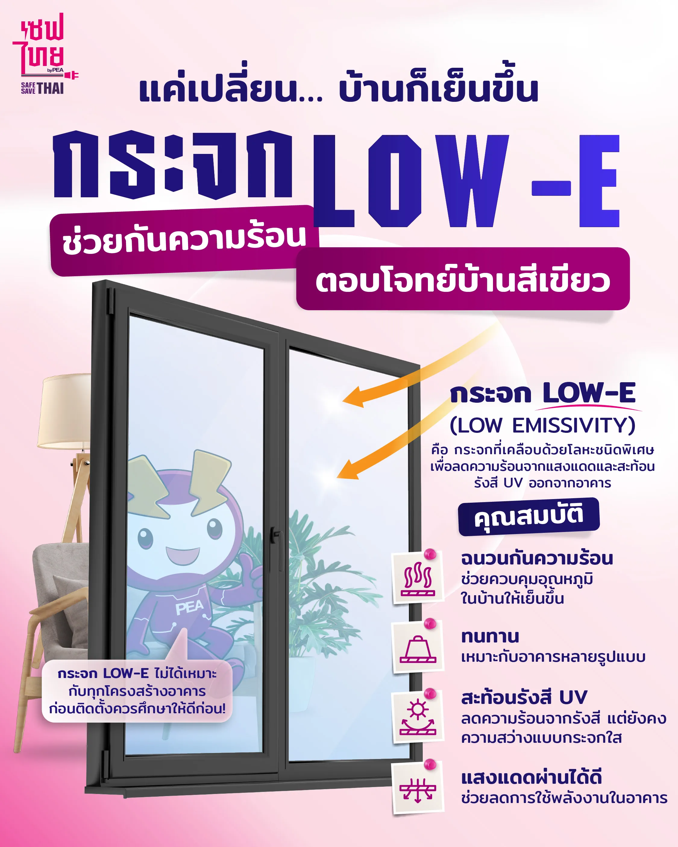 กระจก Low-E (Low Emissivity) คือ กระจกที่เคลือบด้วยโลหะชนิดพิเศษ ที่มีคุณสมบัติในการลดความร้อนจากแสงแดดและสะท้อนรังสี UV ออกจากอาคาร ช่วยลดการใช้พลังงาน และทำให้บ้านเย็นขึ้น ❄️