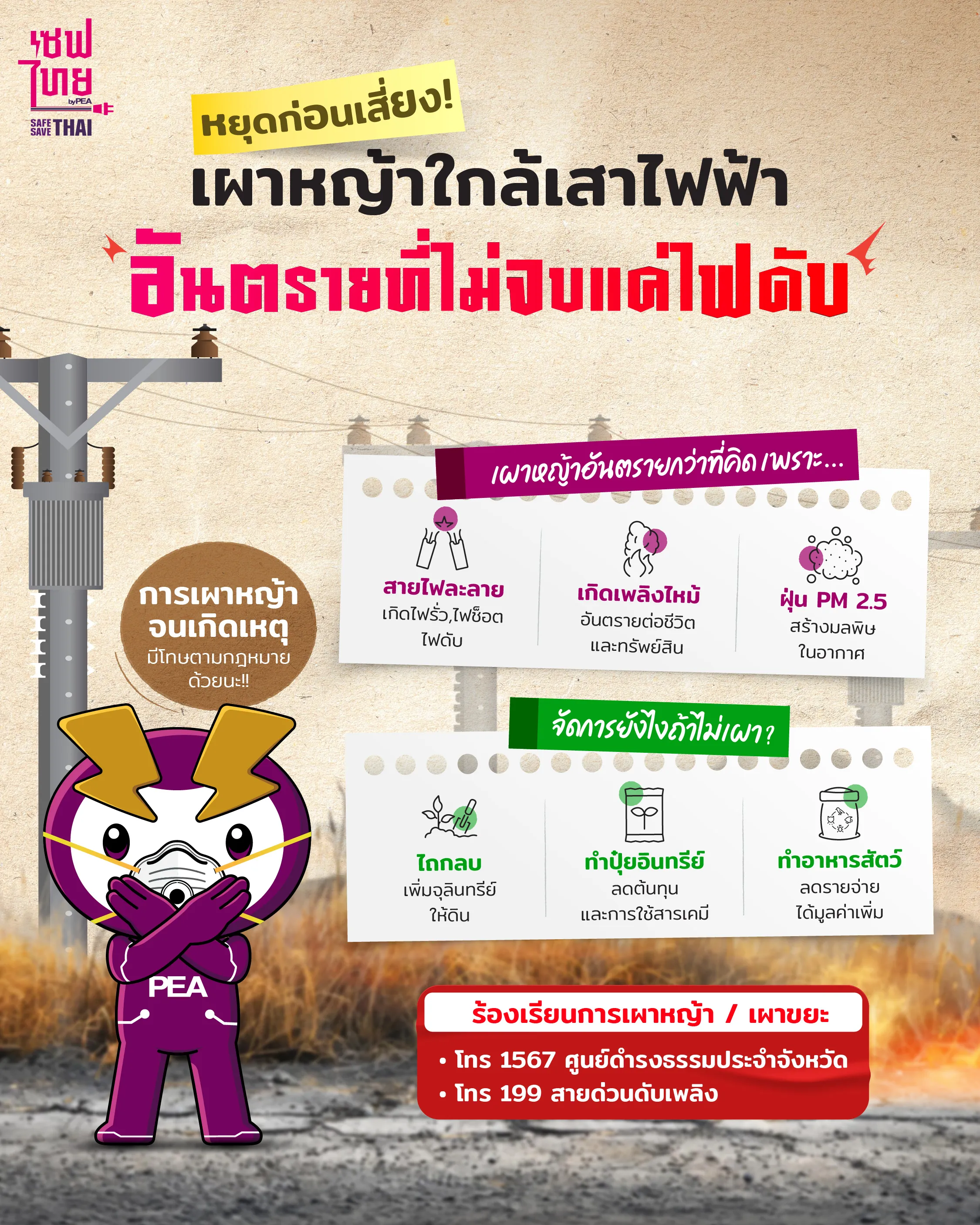 การเผาหญ้าไม่เพียงสร้างมลพิษ PM 2.5 แต่ความร้อนยังทำให้เสาไฟฟ้าใกล้เคียงเสี่ยงสายไฟละลาย สาเหตุของปัญหาไฟรั่ว ไฟดับ และไฟไหม้ด้วย