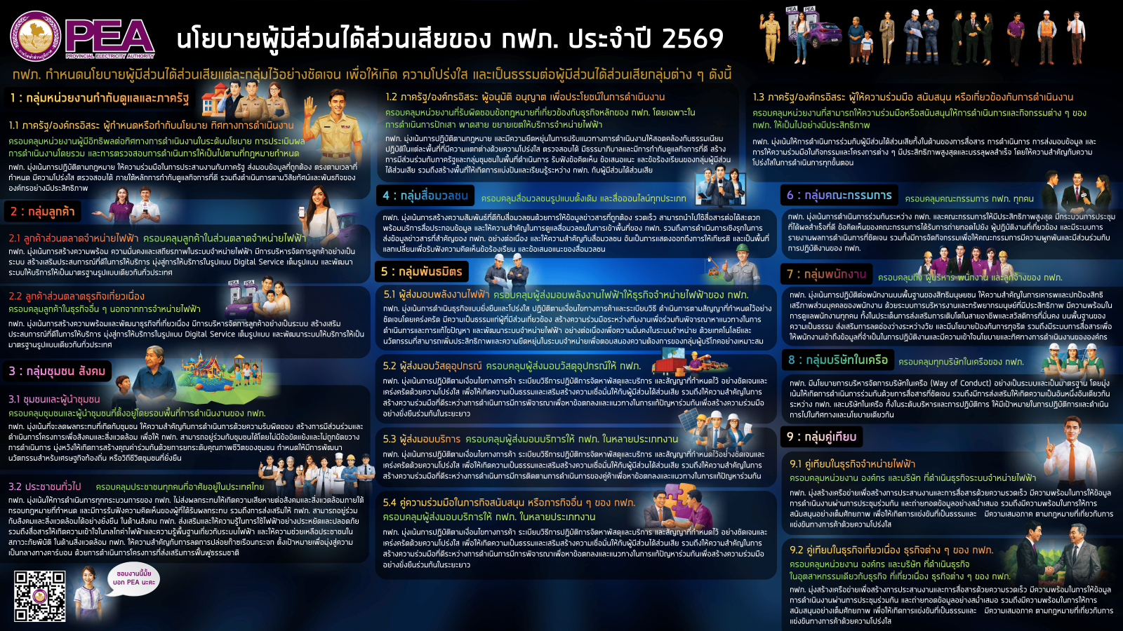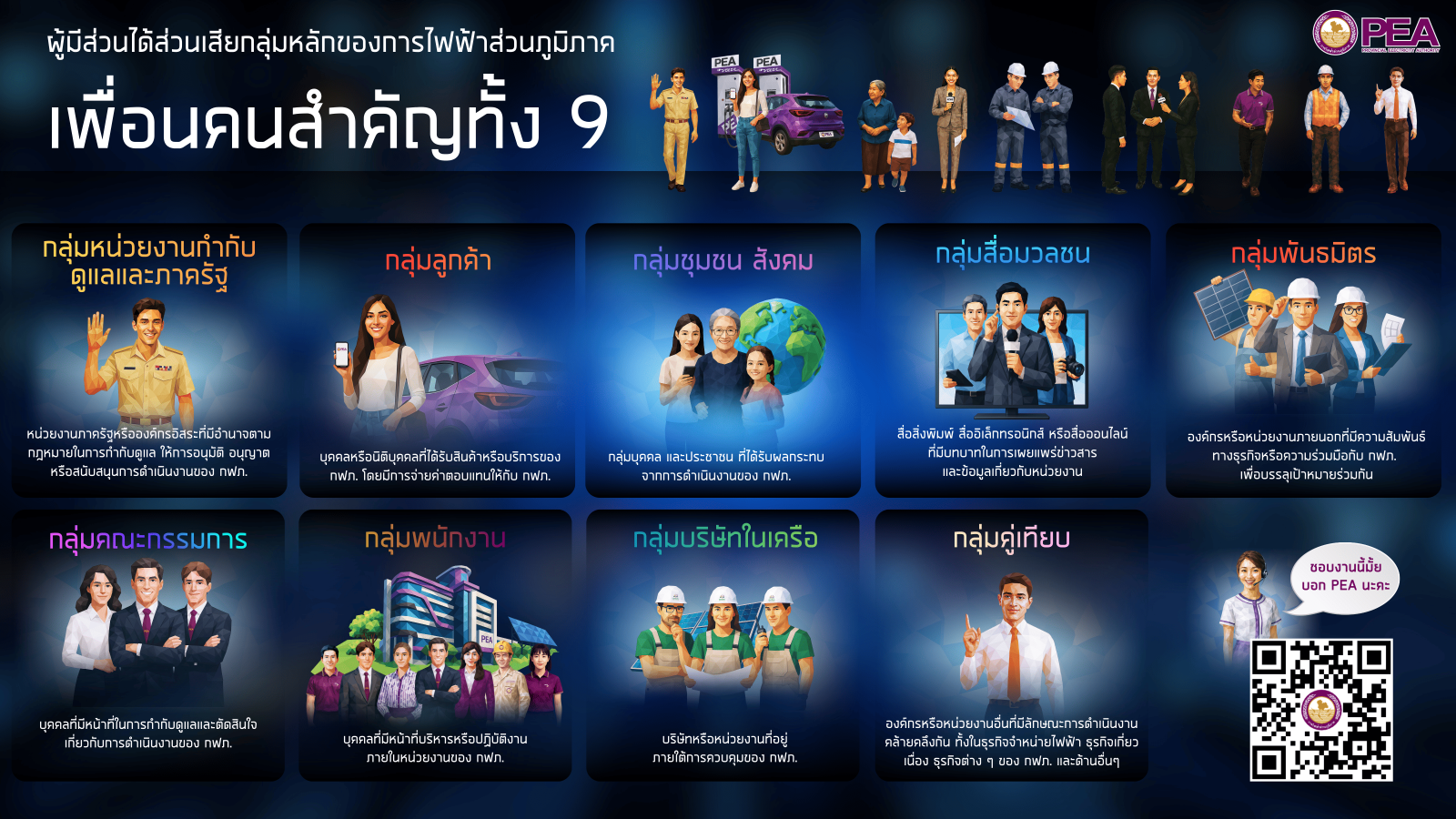 การไฟฟ้าส่วนภูมิภาค (กฟภ.) มุ่งมั่นที่จะเติบโตไปกับชุมชนและสังคมอย่างยั่งยืน จึงให้ความสำคัญกับการบริหารจัดการผู้มีส่วนได้ส่วนเสียทุกส่วน ด้วยการมุ่งเน้นการดำเนินงานที่ตอบสนองความต้องการ ความคาดหวังของผู้มีส่วนได้ส่วนเสียอย่างเป็นระบบ และการสื่อสารที่มีประสิทธิภาพ ภายใต้การเคารพสิทธิ และปฏิบัติต่อผู้มีส่วนได้ส่วนเสียอย่างเป็นธรรม ตลอดจนส่งเสริมการมีส่วนร่วมของผู้มีส่วนได้ส่วนเสีย เพื่อลดผลกระทบรอบด้านในทุกขั้นตอนการปฏิบัติงาน สร้างความเชื่อมั่น และเสริมสร้างความสัมพันธ์กับผู้มีส่วนได้ส่วนเสียอย่างเหมาะสม อันเป็นปัจจัยพื้นฐานที่นำไปสู่การเป็นองค์กรที่ดำเนินธุรกิจให้เติบโตได้อย่างยั่งยืน