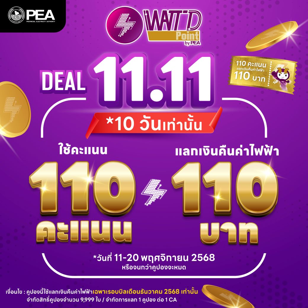 🔮 แคมเปญ 11/11 มาแล้ว! ✨ PEA แจกเงินคืนค่าไฟฟ้าสุดคุ้ม 💜 แค่มีคะแนน Watt-D Point 110 คะแนน ก็แลกรับเงินคืนค่าไฟฟ้าทันที 110 บาททันที! 📱