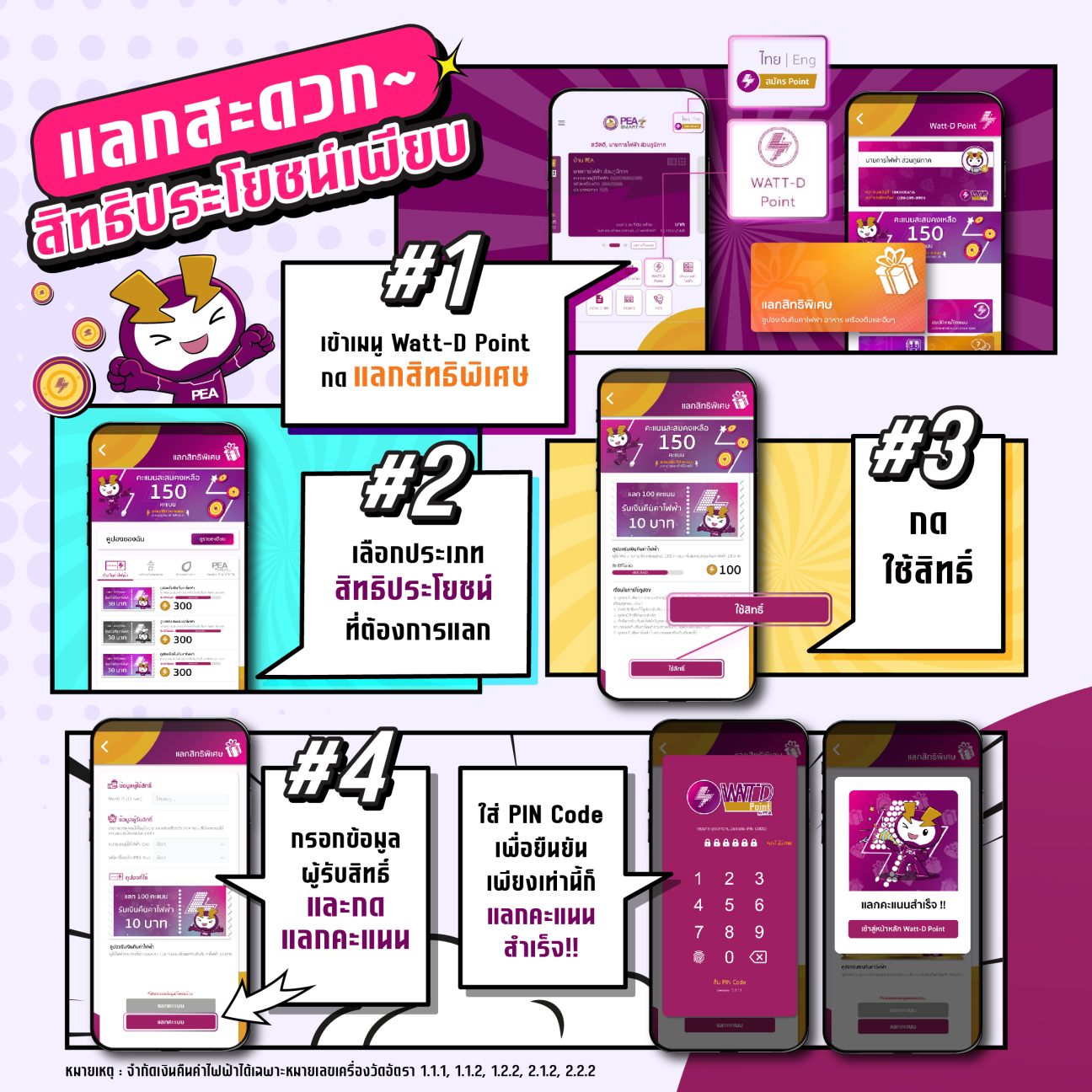 *หมายเหตุ: สามารถกดแลกคะแนนสะสมฯ ได้ที่แอปพลิเคชัน PEA Smart Plus เท่านั้น กรณีที่ท่านเป็นเจ้าของเครื่องวัดมากกว่าหนึ่งหมายเลข ท่านสามารถนำคะแนนสะสมจากหมายเลขผู้ใช้ไฟฟ้า (CA) ที่มีหมายเลขบัตรประชาชน (ID) และนำคะแนนสะสมไปแลกรับเงินคืนค่าไฟฟ้าให้กับหมายเลขเครื่องวัดหมายเลขใดหมายเลขหนึ่งได้ ตามเงื่อนไขการแลกคะแนนสะสม Watt-D Point
